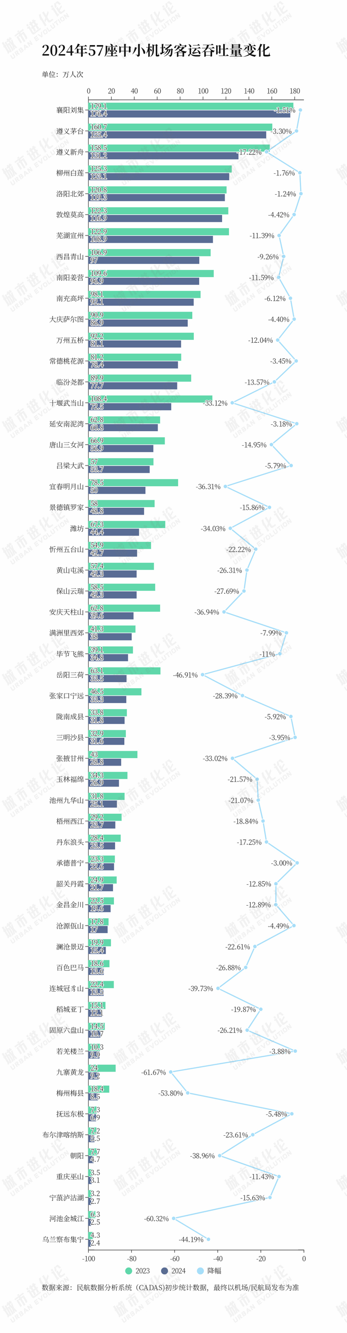 2024年,宜春明月山机场客流下降了36%,遵义新舟机场下降了17%,遵义茅台机场下降了3%。过去一年,这些机场所在的城市并没有新开高铁,但当地的重点产业有明显变化。