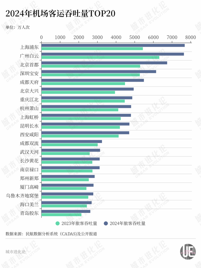 2024年,上海浦东机场反超广州白云机场,成为全国客流量最高的单一机场,年客流量达到7679万人次。白云机场以7637万人次的客流退居第二位,之后依次是北京首都、深圳宝安、成都天府,这些机场的客流涨幅均在20%以上。