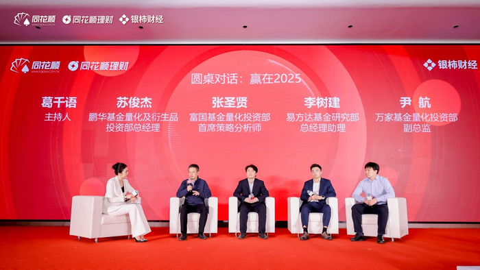进入圆桌讨论环节,鹏华基金量化及衍生品投资部总经理苏俊杰、富国基金量化投资部首席策略分析师张圣贤、易方达基金研究部总经理助理李树建、万家基金量化投资部副总监尹航四位行业大咖,就如何提升投资者体验展开了深入探讨