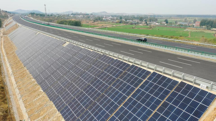 作为全国首条改扩建零碳高速,济菏高速如同一条光伏巨龙,服务区、收费站、匝道圈、边坡等点位,光伏组件成片有序分布;于细节处,边坡光伏一体化装置让光伏与边坡紧密贴合、融为一体,提高转化效率的同时安全性更强。