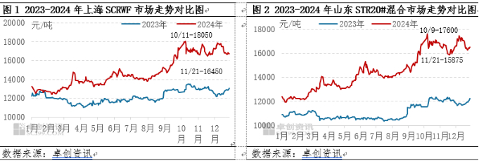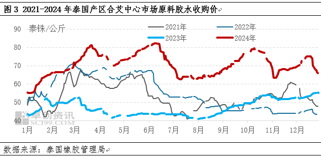 但从天然橡胶生产的季节性来看,2024年四季度海外正值旺产季,泰国东北部天气正常,泰国南部12月中下旬起天气好转;叠加高价原料刺激产出,新胶上量压力拖累胶价运行。同时EUDR推迟一年执行落地,原料估值向下修复,胶价成本重心走低,制约胶价运行。