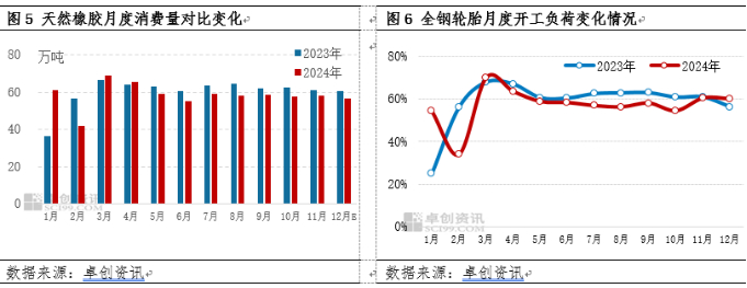 需求方面,四季度天然橡胶消费量呈现弱稳表现,主要消费下游轮胎终端表现低迷,轮胎需求意向减弱,难以提振胎企开工走高。同时四季度胶价重心仍然处于年内高位水平,下游成本端压力突出,采购仅维持逢低刚需,市场交易量难有明显提升,对胶价支撑不足。预计2024年四季度,国内天然橡胶消费量约174.45万吨,环比下滑1.61%,同比减少6.03%。
