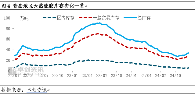 另从国内市场来看,2024年四季度,随着船货陆续到港叠加国储胶入库,青岛地区天胶库存累库节奏加快。据卓创资讯统计,12月27日当周,青岛地区天然橡胶样本仓库库存33.73万吨,较11月底增加4.32万吨,增幅14.69%,累库节奏加快,胶价缺乏向上支撑。