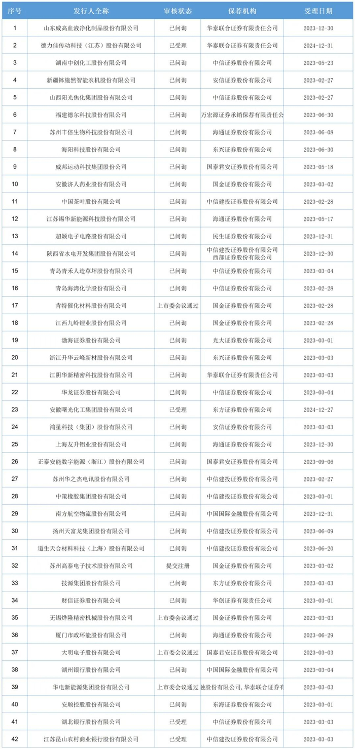 截至1月9日,上交所公布沪市主板IPO企业排队42家,4家上市委会议通过,1家提交注册,4家已受理,33家已问询。