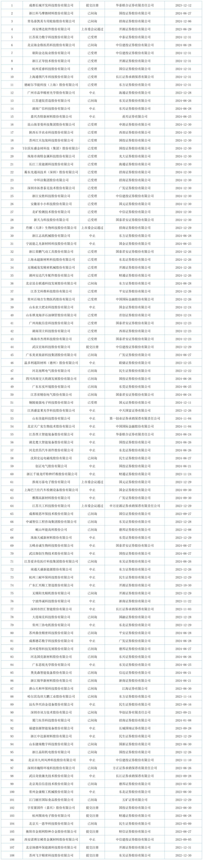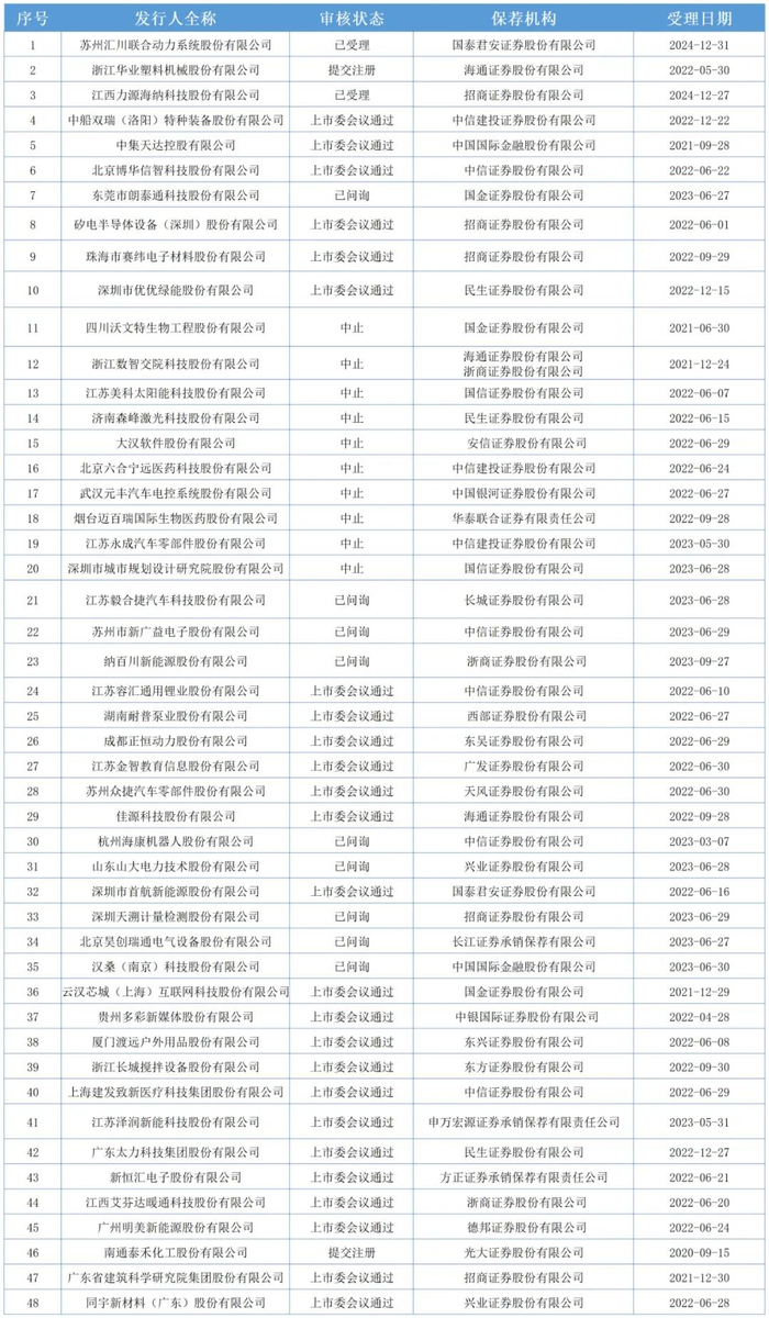 截止2025年1月9日,深市主板排队企业有31家,沪市主板排队企业有42家,创业板排队企业有48家,科创板排队企业有21家,北交所排队企业有108家。