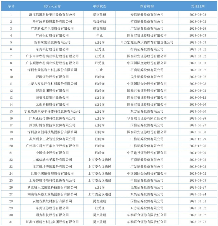 截至1月9日,深交所公布深市主板IPO企业排队31家,5家上市委会议通过,5家提交注册,4家已受理,14家已问询,1家暂缓审议,中止2家。
