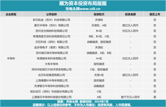 顺为资本对半导体行业的投资布局广泛,涵盖了从芯片设计、制造到应用的全产业链。顺为资本的投资组合包括新芯航途、篆芯半导体、锐石创芯、南芯科技等一系列项目。这些企业在各自领域内都展现出了强劲的创新能力和市场竞争力。据充电头网不完全统计,顺为资本对外投资的这15家半导体企业中,上市公司有1家。