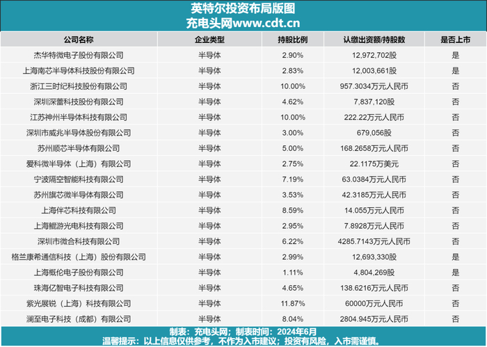 英特尔中国在半导体领域有较为广泛的对外投资。据充电头网不完全统计,英特尔外投资的半导体类型企业有18家。投资半导体领域可以使英特尔有能力满足市场在高性能计算、智能设备、通信等多方面的芯片需求,比如为人工智能服务器提供强大的计算芯片,为物联网设备提供低功耗、高性能的芯片。