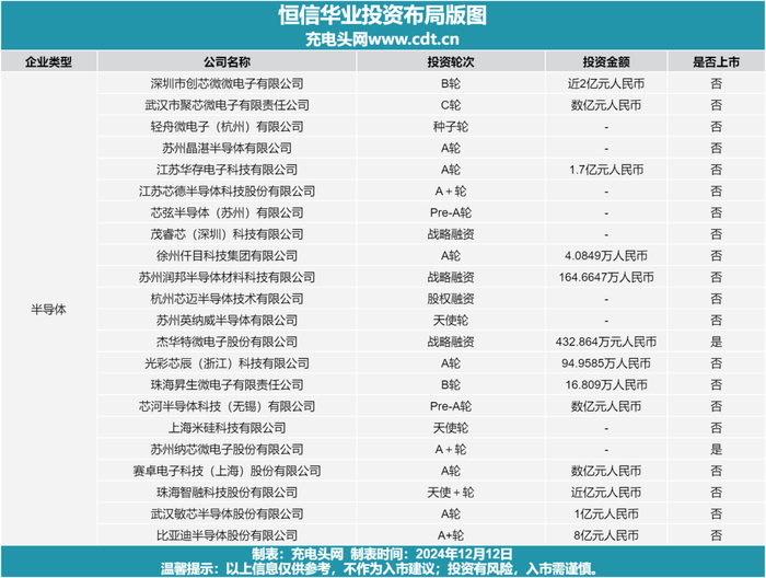 恒信华业在半导体领域投资广泛,包括芯河半导体、敏芯半导体、纳芯微、杰华特等企业。芯河半导体是国内首家独立的家庭网络芯片供应商;敏芯半导体专注于光通信用激光器和探测器芯片产品。据充电头网不完全统计,恒信华业对外投资的这22家半导体企业中,上市公司有2家。