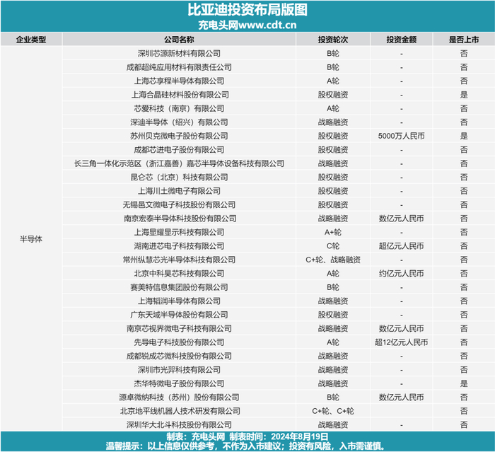 据充电头网不完全统计,比亚迪对外投资的这28家半导体企业中,上市公司有3家,占比10.71%;非上市公司25家,占比89.29%。通过投资不同类型的半导体企业,比亚迪能够完善自身在半导体产业链上的布局,实现从芯片设计、制造到封装测试等环节的全覆盖,提高自身的产业协同效应和综合竞争力。