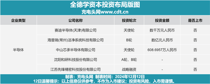 全德学资本投资方向主要集中在半导体各细分领域,如芯片设计、设备材料等,覆盖了集成电路产业链的多个关键环节,同时紧跟半导体技术发展前沿,如先进封装技术、Chiplet技术等,以及新兴应用场景如人工智能、物联网、新能源汽车等领域对半导体芯片的需求,挖掘具有潜力的投资项目。如公司对中山芯承半导体有限公司进行了天使轮投资,中山芯承半导体公司专注于研发和量产高密度倒装芯片封装基板,填补国内高端基板空白。