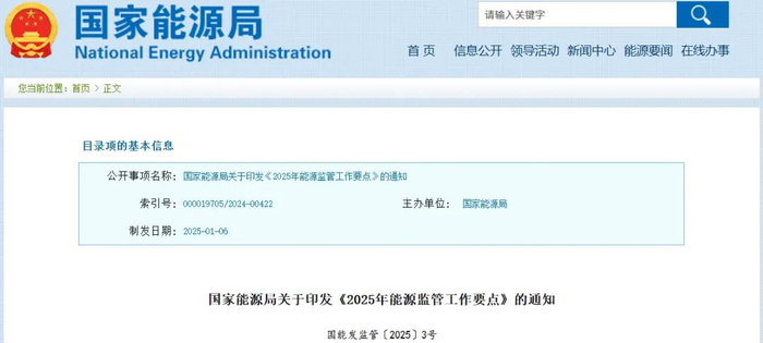 国家能源局网站1月10日消息,《2025年能源监管工作要点》发布。