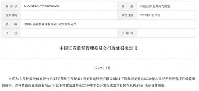 1月10日晚,证监会公布了2025年1号行政处罚决定书。因在国美通讯股份有限公司(简称“*ST美讯”,600898.SH)2020年非公开发行股票项目保荐项目、吉林紫鑫药业股份有限公司(简称“紫鑫药业”,退市)2014年非公开发行股票项目保荐项目中未勤勉尽责,东吴证券合计被证监会罚没1336.44万元,四位相关责任人合计被罚170万元,罚款总计达到了1506万元。