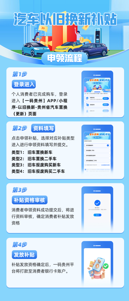 本次贵州省汽车以旧换新补贴申领和发放通过一码贵州APP进行,消费者可在一码贵州APP/小程序进行实名认证,登陆进入一码贵州以旧换新专区【汽车补贴板块】进行补贴申领。