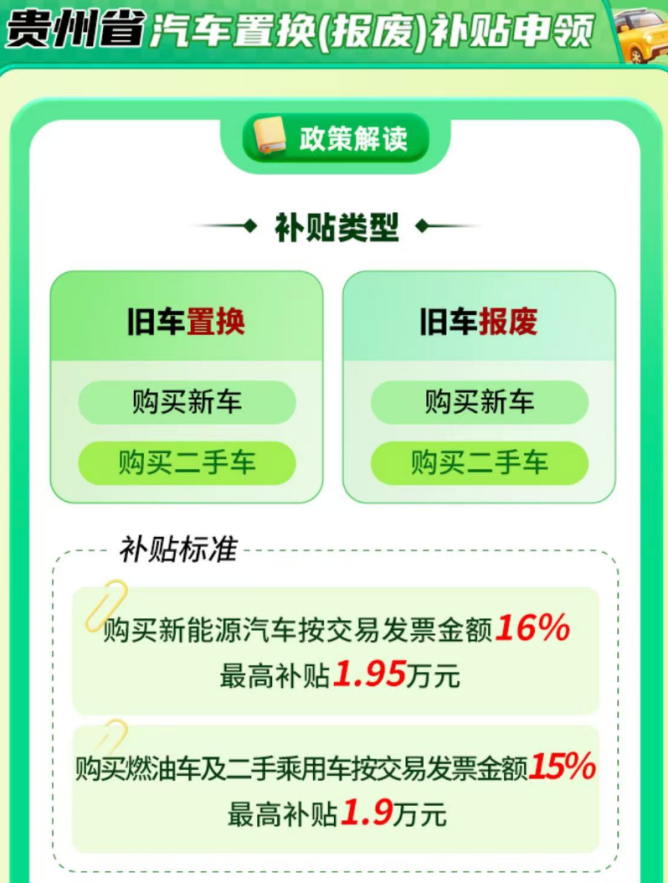 购买纳入《减免车辆购置税的新能源汽车车型目录》的新能源乘用车、燃油乘用车或二手乘用车且新车销售发票出具地为贵州省范围内的,可参与我省汽车置换(报废)更新活动,按规定上传相关材料并审核通过后,将按购买新能源汽车统一按交易发票(价税合计)金额16%给予补贴,最高补贴1.95万元;燃油车及二手乘用车(含二手新能源车)按交易发票(价税合计)金额15%给予补贴,最高补贴1.9万元