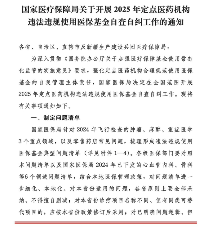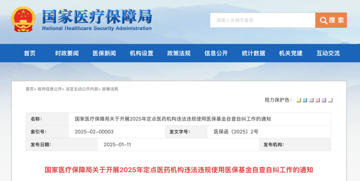 今日(1月11日),国家医保局发布《国家医疗保障局关于开展2025年定点医药机构违法违规使用医保基金自查自纠工作的通知》(以下简称《通知》),决定在全国范围开展2025年定点医药机构违法违规使用医保基金自查自纠工作。