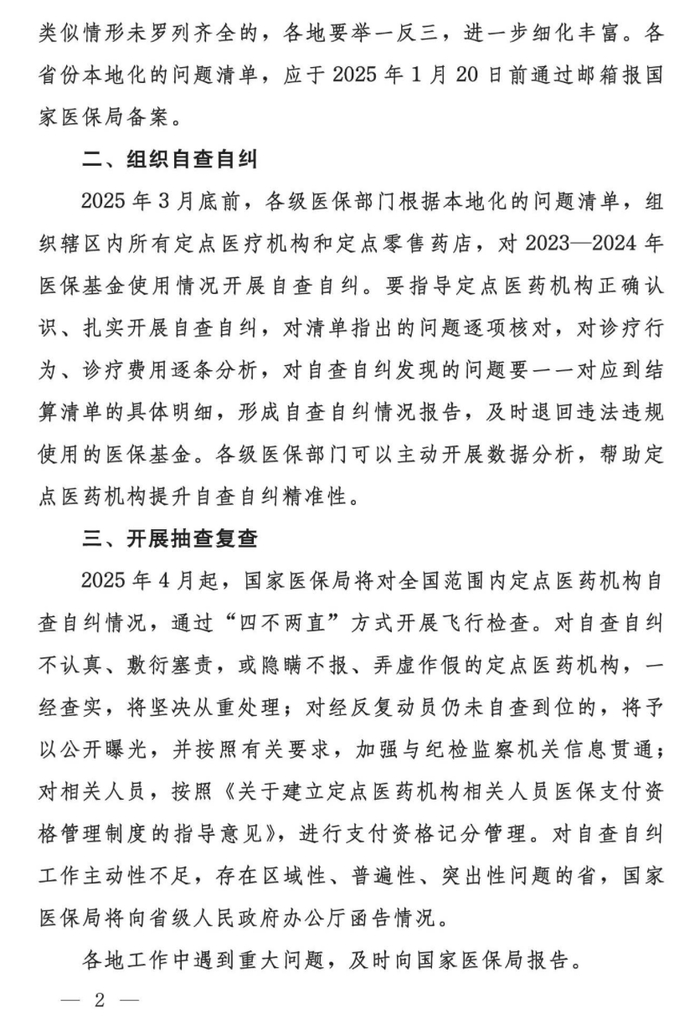 2025年4月起,国家医保局将对全国范围内定点医药机构自查自纠情况,通过“四不两直”方式开展飞行检查。