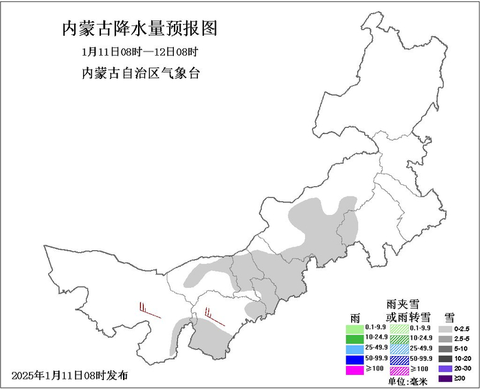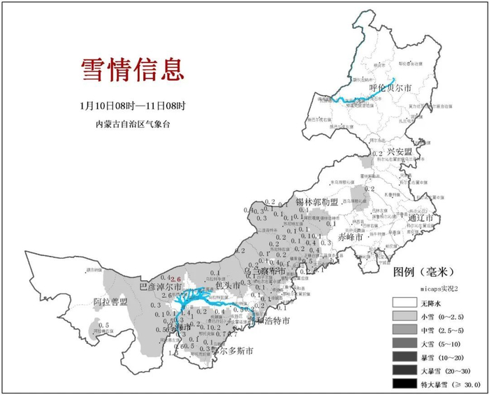 随着冷空气的到来,西中部多地及东部部分地区陆续出现降雪天气。监测显示,10日08时-11日08时,全区10个盟市36个旗县的99个站点出现降雪,降雪主要出现在巴彦淖尔市、鄂尔多斯市、呼和浩特。其中,1个站出现中雪,36个旗县98个站出现小雪。中雪出现在巴彦淖尔市乌拉特后旗获各琦苏木满都拉,降雪量2.6毫米。另外,鄂尔多斯市鄂托克旗木肯淖镇旧庙湾降雪量为2.1毫米、呼和浩特新城区奎素沟顶降雪量为1.9毫米、乌海市海勃湾区乌海降雪量为1.9毫米。