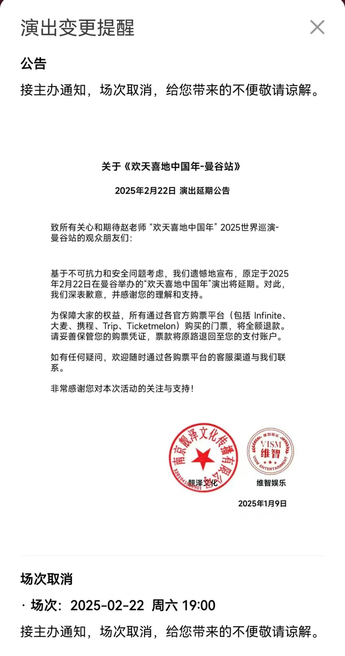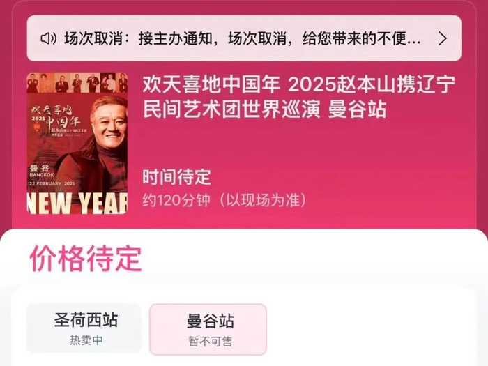据大麦网APP发布的公告显示,1月9日,“欢天喜地中国年”2025赵本山携辽宁民间艺术团世界巡演-曼谷站官宣延期。