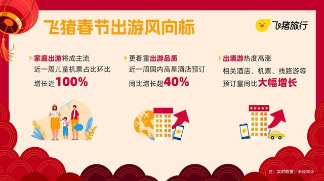 家庭结伴出行将成为今年春节期间的主流。飞猪预测,今年春节家庭出游人群的占比将在去年的基础上进一步攀升。数据显示,近一周,飞猪上国内高星酒店的预订量同比增长超40%。
