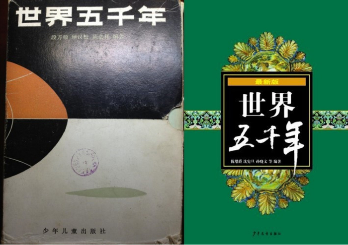 左:《世界五千年》1985年版,段万翰、顾汉松、陈必祥编著,少年儿童出版社出版;右:《世界五千年》2012年版,陈增爵、沈宪旦、孙晓文编著,少年儿童出版社出版