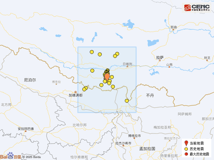 历史地震:根据中国地震台网速报目录,震中周边200公里内近5年来发生3级以上地震共69次,最大地震是2025年1月7日在西藏日喀则市定日县发生的6.8级地震(距离本次震中5公里),按震级大小前50次历史地震分布如图。