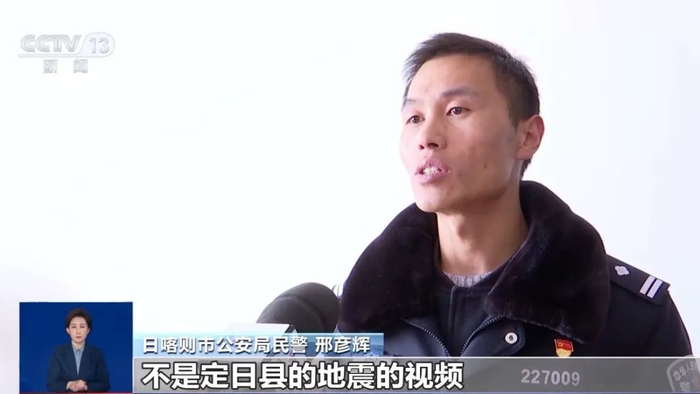 日喀则市公安局民警 邢彦辉:地震当日晚8点多,我在刷某平台视频的过程中,看到一个关于定日地震的视频。视频的内容是某人在推着自行车,地震突然发生,他就左摇右晃。我通过他的着装及周围的环境判断不是定日县的地震的视频。我随即向该平台进行了举报。