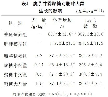 西安交通大学的药理学教授袁秉祥通过实验研究了魔芋甘露聚糖(即葡甘聚糖)对营养性肥胖大鼠的影响。研究人员将72只大鼠按体重和雌雄均衡随机分为6组,对比普通饲养组、肥胖模型组、魔芋精粉组(魔芋精粉食用量为0.7g/kg)、魔芋甘露聚糖小、中、大剂量组(魔芋精粉食用量分别为0.17g/kg,0.5g/kg,1.5g/kg)大鼠的体重、体长、体重增长和Lee's指数(评价成年大鼠肥胖程度的有效指数)。