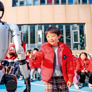 浙江省宁波市江北区甬港幼儿园的孩子们在科普活动现场近距离观察人形机器人(2025年1月2日摄)江汉摄/本刊