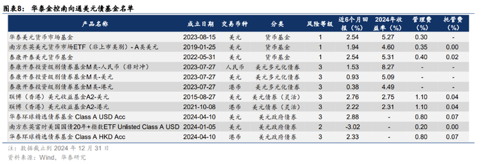 目前境内可以申购的香港互认基金已经扩容至127只,其中包括了47只股票型基金、74只债券型基金以及6只混合型基金,不过投资美元债的基金数量较少,目前仅有10只,分别为摩根国际债券基金、易方达(香港)精选债券基金、南方东英精选美元债券基金。2025年1月1日起,香港互认基金客地销售比例限制由50%放宽至80%,释放了部分投资额度。截止2025年1月5日,南方东英精选美元债以及摩根国际债券处于可申购状态。境内投资者可以用人民币申购互认基金,不会占用外汇额度。(关于香港互认基金的详细分析可以参见华泰金工组报告《跨境投资之香港互认基金解析》2024/8/20)