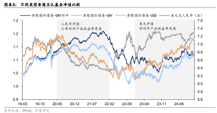 2025年1月1日起,香港互认基金客地销售比例限制由50%放宽至80%,释放了部分投资额度。境内投资者可以用人民币申购互认基金,不会占用外汇额度。相对国内债券基金而言,香港互认基金管理费、托管费等更高,且基金分红需要缴纳20%的个人所得税。对于跨境投资香港互认基金而言,主要包括了美债利率波动风险以及汇率风险,部分互认基金提供了不同的种类供投资者选择,比如是否进行汇率对冲。