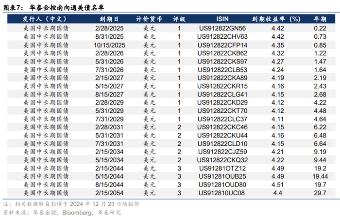 跨境理财通可投资产品种类丰富。以华泰金控为例,提供货币型、债券型、股票型及混合型公募基金,包含中资、外资不同类型的管理人,及不同币种的基金,甚至可以直接投资海外债券,如美国国债,到期年限从1个月到30年期不等。