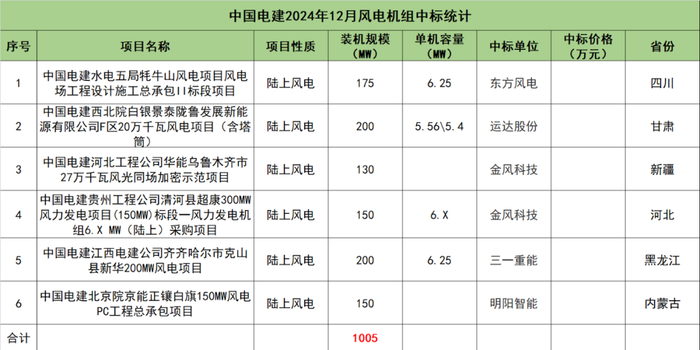 中国电建开标项目共6个,总装机规模为1005MW,由东方风电、运达股份、金风科技、三一重能、明阳智能5家整机商中标。