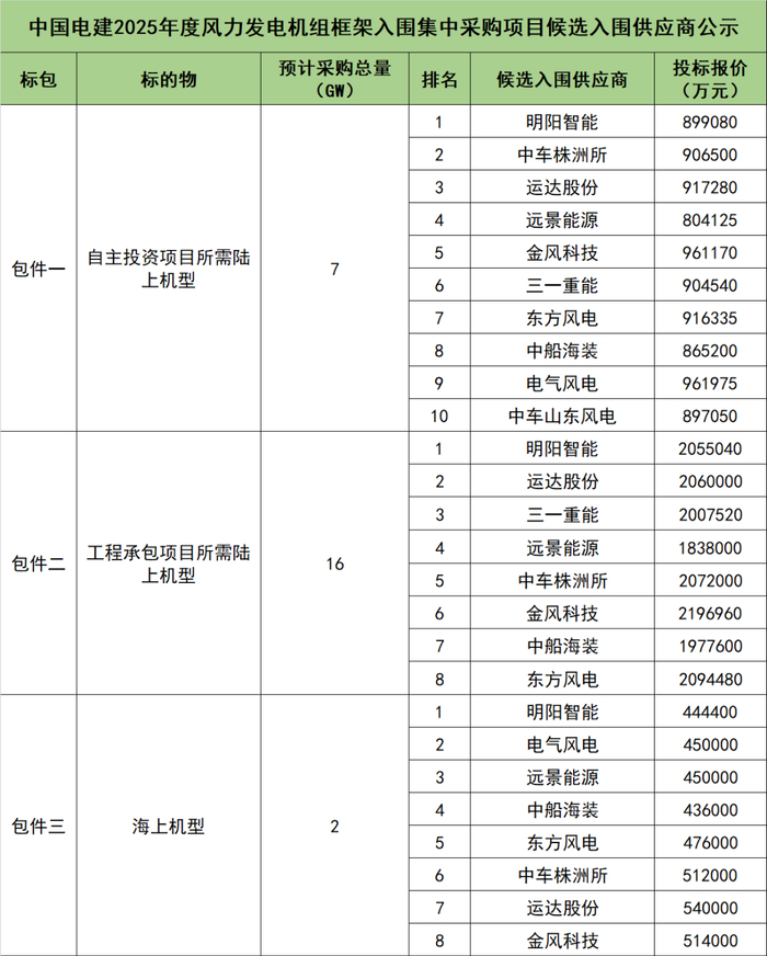 中国电建集团(股份)公司2025年度风力发电机组框架入围集中采购项目预计装机总量25GW,其中陆上总量预计为23GW,海上总量预计为2GW,分3个包件进行投标