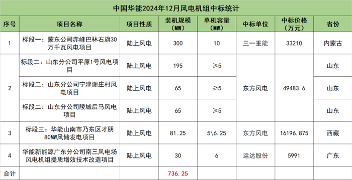 中国华能开标项目共4个,总装机规模为736.25MW,由三一重能、东方风电、运达股份3家整机商中标。