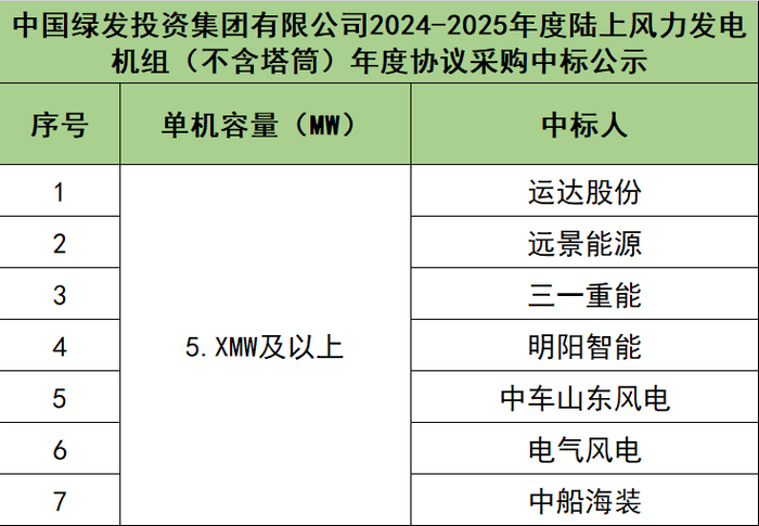 中国绿发投资集团有限公司2024-2025年度陆上风力发电机组(不含塔筒)年度协议采购单机容量5.XMW及以上的陆上风力发电机组。中标人包括运达股份、远景能源、三一重能、明阳智能、中车山东风电、电气风电、中船海装7家整机商。