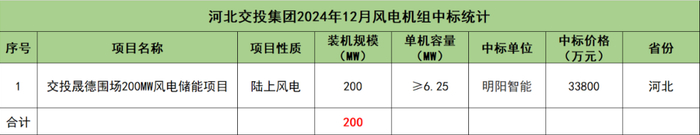 河北交投集团开标项目共1个,总装机规模为200MW,由明阳智能1家整机商中标。