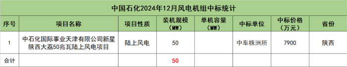 中国石化开标项目共1个,总装机规模为50MW,由中车株洲所1家整机商中标。