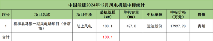 中国能建开标项目共1个,总装机规模为100.1MW,由运达股份1家整机商中标。