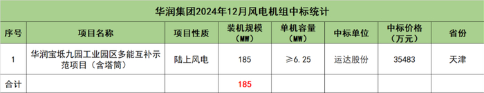 华润集团开标项目共1个,总装机规模为185MW,由运达股份1家整机商中标。