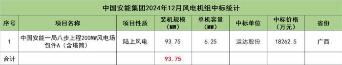 中国安能集团开标项目共1个,总装机规模为93.75MW,由运达股份1家整机商中标。