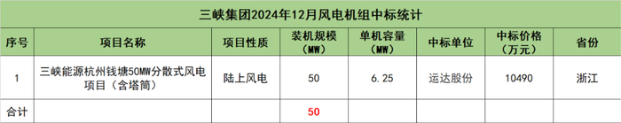 三峡集团开标项目共1个,总装机规模为50MW,由运达股份1家整机商中标。