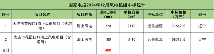 中广核广东江门川岛一400MW海上风电场:一标段200MW由明阳智能预中标,二标段200MW由远景能源预中标。项目总装机容量400MW,拟采购单机容量14000kW及以上的海上风电机组;项目预计在2025年6月15日前完成不少于10台风机交货,2025年8月30日前完成标段内全部风机交货。