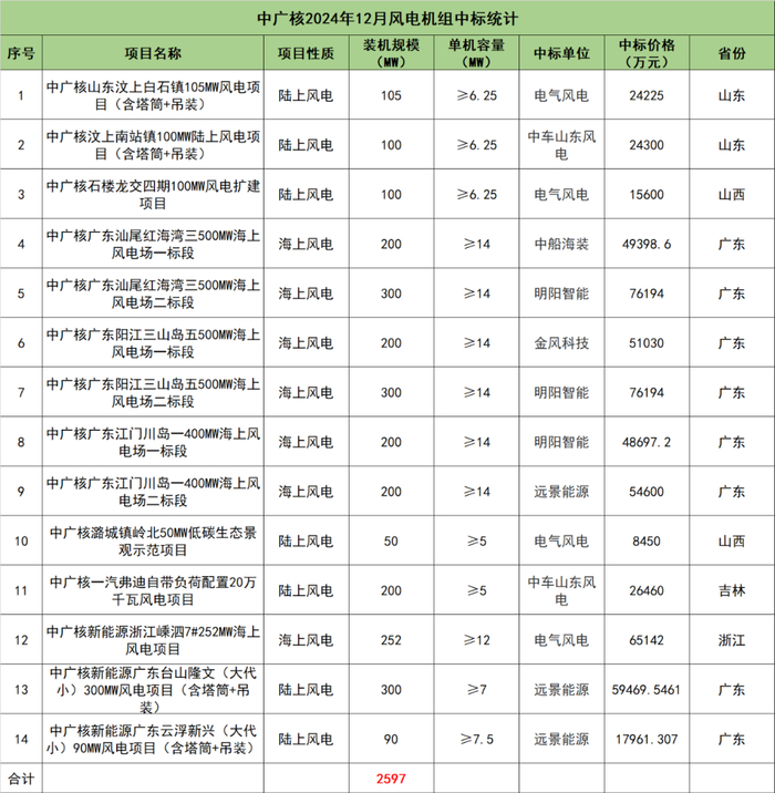 中广核开标项目共14个,总装机规模为2597MW,由电气风电、中车山东风电、中船海装、明阳智能、金风科技、远景能源6家整机商中标。