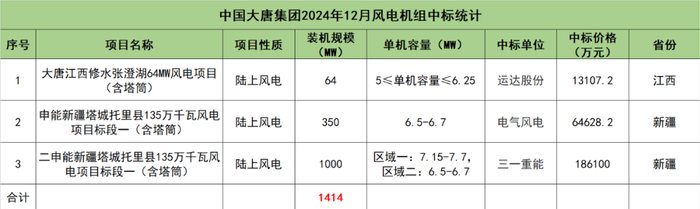 中国大唐集团开标项目共3个,总装机规模为1414MW,由运达股份、电气风电、三一重能3家整机商中标。