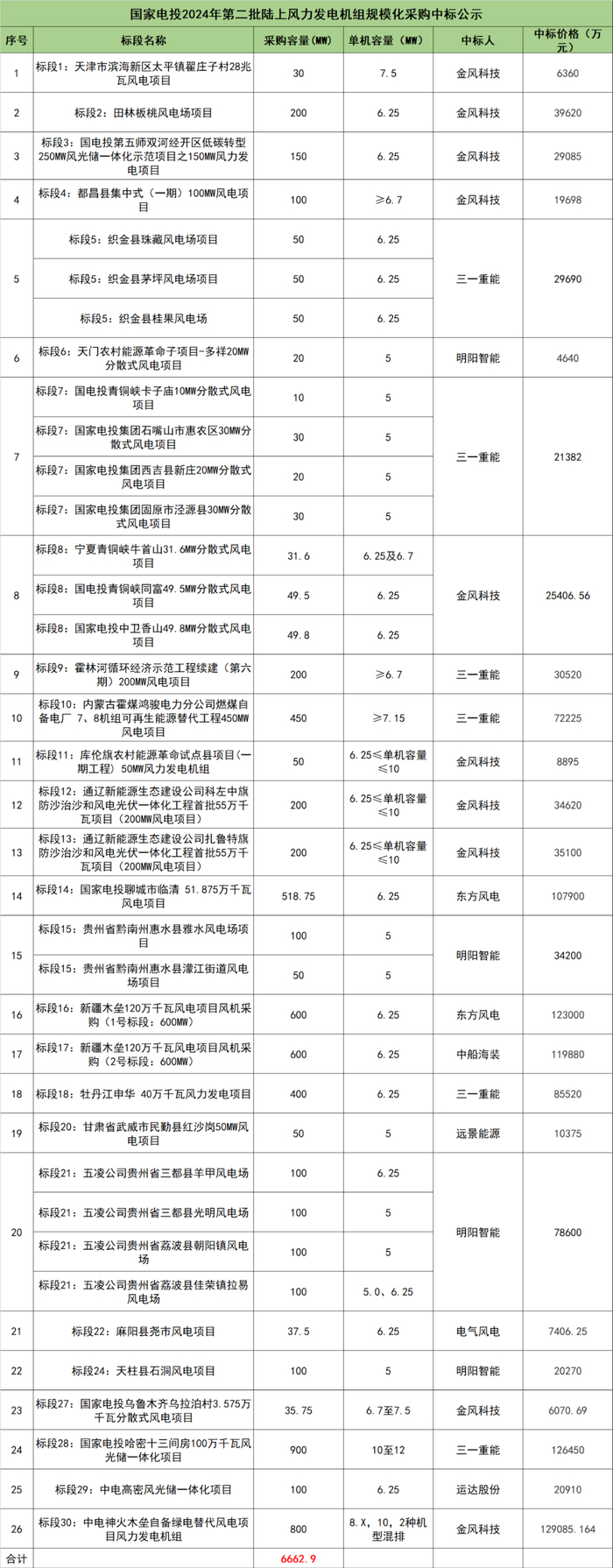 国家电投2024年第二批陆上风力发电机组规模化采购包括采购容量7204.9MW以及储备容量1200MW。由于标段19、标段23、标段25、标段26未开标,故此次总采购容量为6662.9MW(未计算储备容量1200MW)。