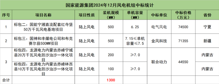 国家能源集团开标项目共3个,总装机规模为1300MW,由电气风电、金风科技、联合动力3家整机商中标。