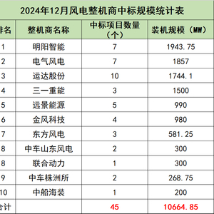2024年12月份,风电项目开标总装机容量共计10664.85MW(不含集采项目),共有11家整机商中标,其中明阳智能、电气风电、运达股份中标规模位居前三。