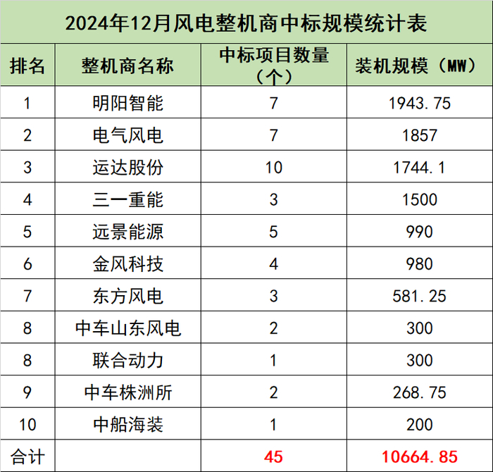 东方风电排名第七,中标3个风电项目,中标规模累计581. 25MW;