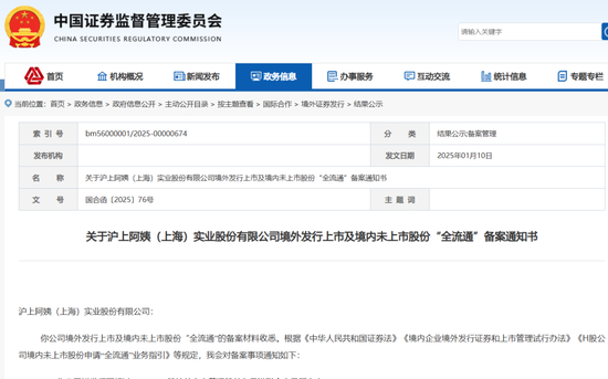 据中国证监会网站,1月10日晚间,中国证监会发布关于沪上阿姨(上海)实业股份有限公司(以下简称沪上阿姨)境外发行上市及境内未上市股份“全流通”备案通知书。
